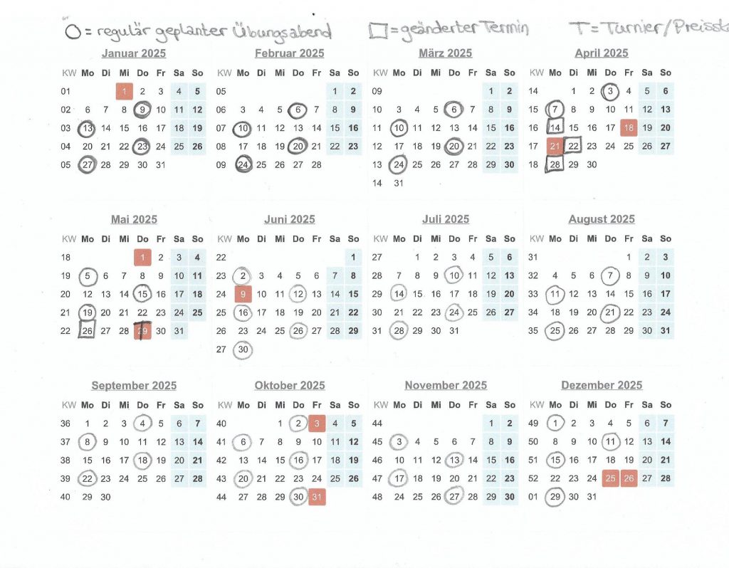 Jeweils um 19 Uhr finden die Spielabende 2025 abwechselnd montags (in den ungeraden Wochen) und donnerstags (in den geraden Wochen) statt.